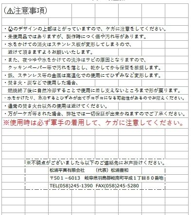 ・通常の焚き火台以外の使用は避けてください。